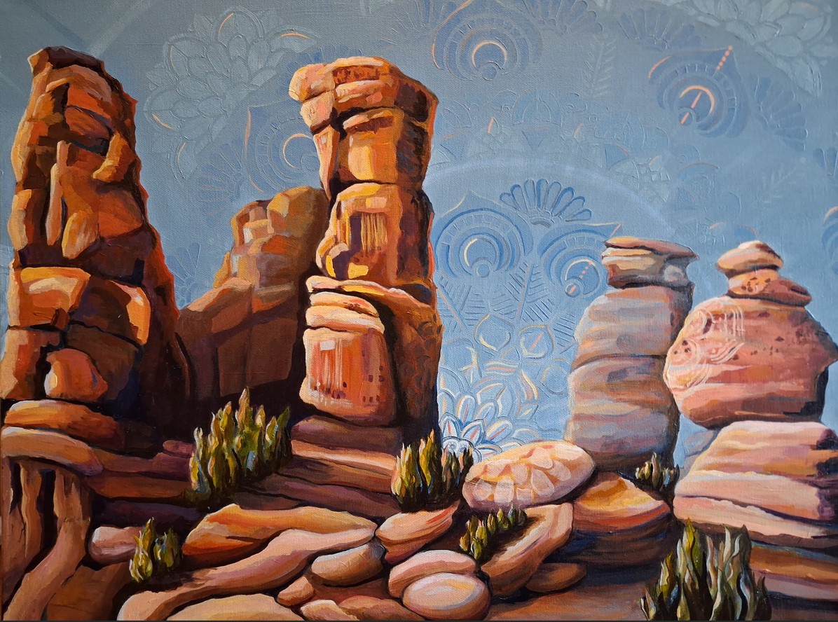 This painting specifically reflects the awe inspired by nature and the authenticity of direct experience within it. The monumental rock formations evoke endurance, time, and presence, while the mandala-like patterns suggest an unseen spiritual dimension woven into the natural world. Together, these elements speak to nature as both a physical and spiritual space—one that invites stillness, reverence, and contemplation. Through this work, I aim to honor the quiet power of nature and its ability to connect us to something larger than ourselves.
